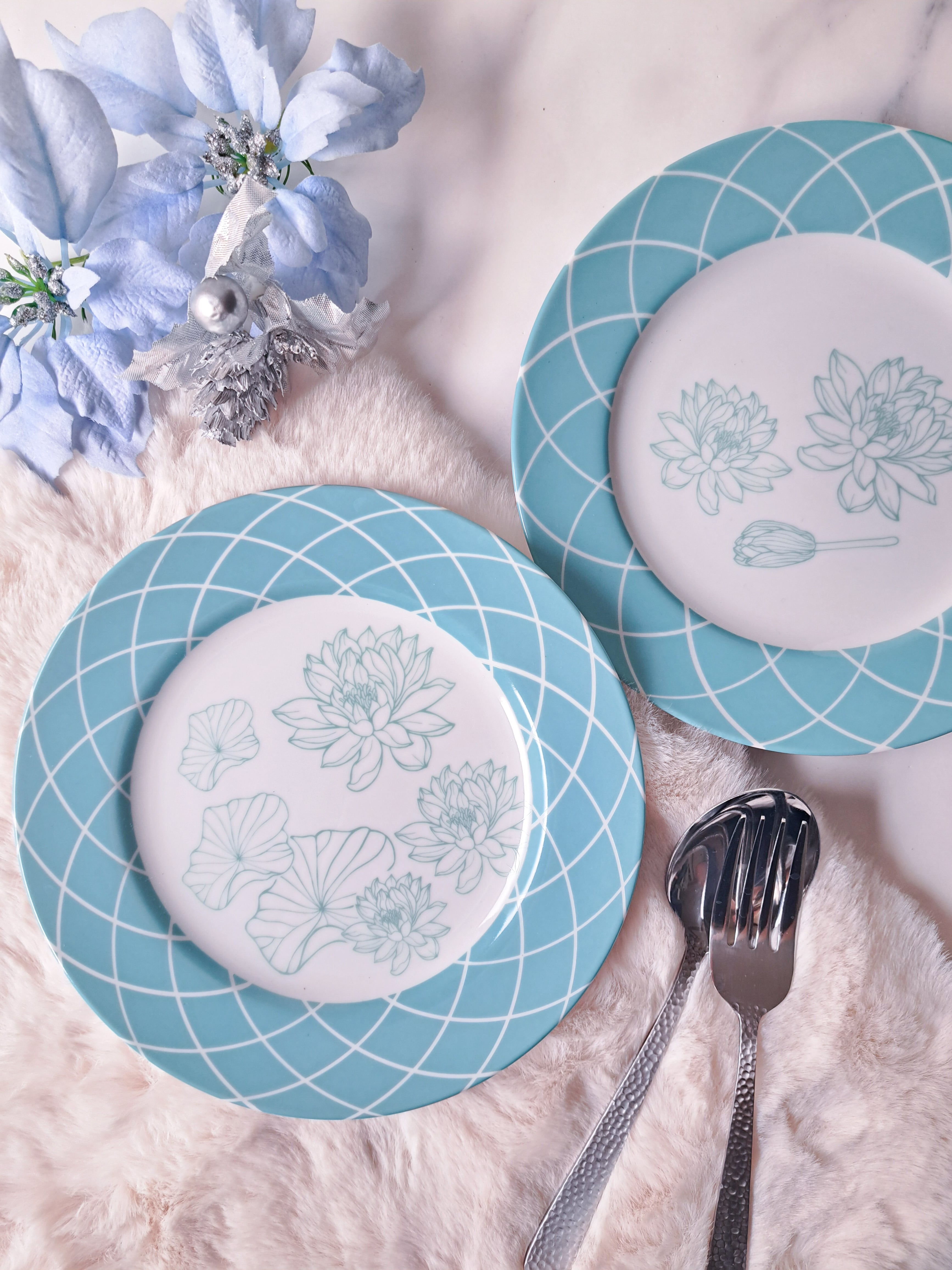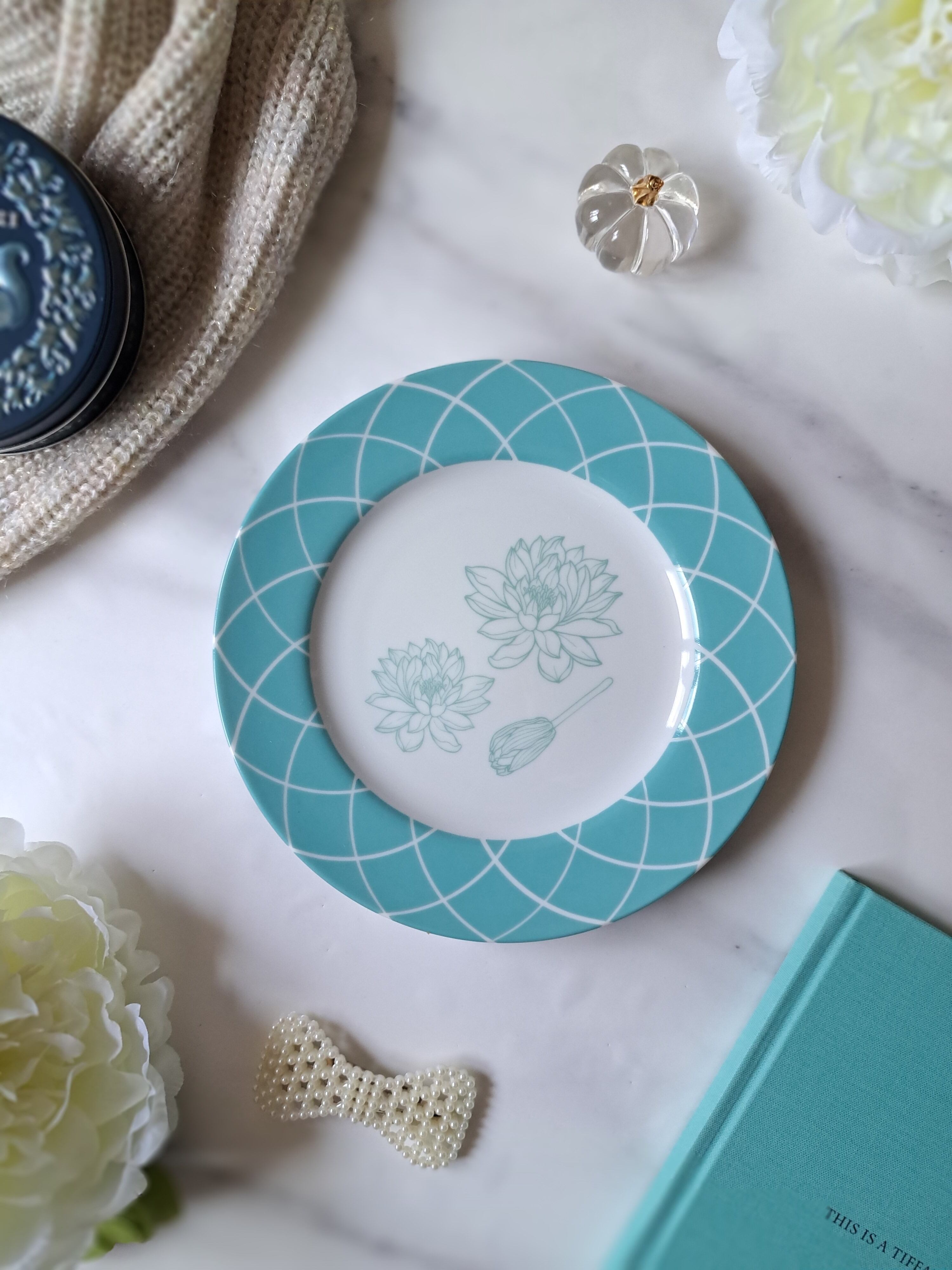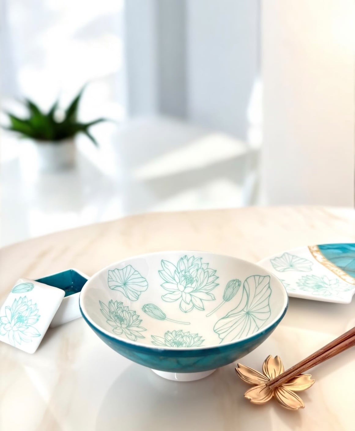 カップやプレートに蓮の花を散りばめるだけでエレガントな印象に。